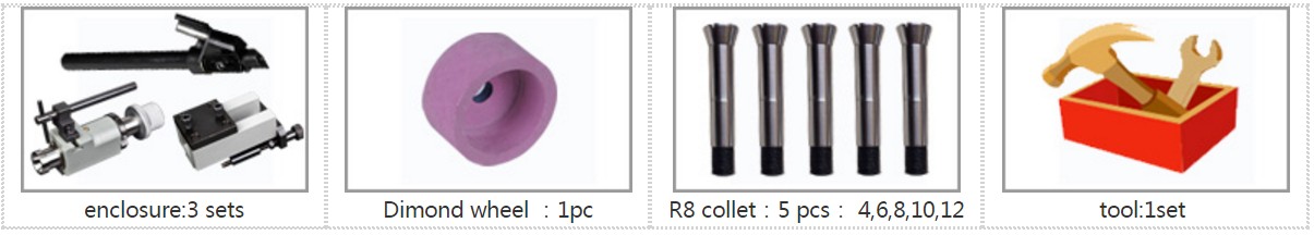 U3 universal grinder can be used to grind half-circle and anti-taper angle'HSS and hard alloy carving tool,one edge and multi-edge tool.The grinding head can be operate on 24 kinds position to grind all kinds of angle and shape.The only thing you need to do is to change the enlosure on the index head .Without any complex steps,you can grind end mill,carve knife,drill bit,tool lathe,bulb end mill.